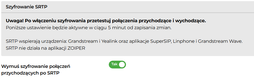 Włącz usługę na swoim koncie SIP: kliknij na ikonę koła zębatego przy numerze konta SIP w panelu klienta, Zaznacz Tak dla “Wymuś szyfrowanie połączeń przychodzących po SRTP”, potwierdź zmiany przyciskiem Zapisz.